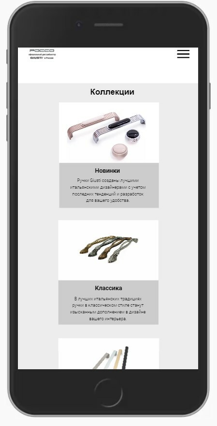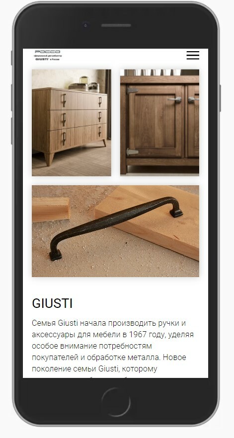ТЗ: Создать минималистичный дизайн для интернет-магазина итальянской мебельной фурнитуры. Во время работы был прописан скрипт для взаимосвязи свойства и фотографии в карусели карточки, соответсвующее этому свойству.